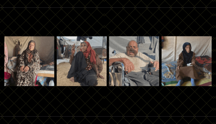 Sadiqa Al-Barrawi, około 90 lat, od października 2023 r. została wysiedlona trzy razy. Obecnie mieszka w namiocie w obozie dla przesiedleńców w Salam wraz z synem, jego żoną i czwórką dzieci. W nocy w styczniu 2025 r., idąc do toalety, upadła i zraniła się, przez co teraz nie może chodzić. Powiedziała Amnesty International: „Od tego czasu życie stało się jeszcze bardziej nieszczęśliwe”. Sadiqa cierpi na cukrzycę i nadciśnienie. Schudła około 25 kg i jest uzależniona od posiłków z kuchni charytatywnych.