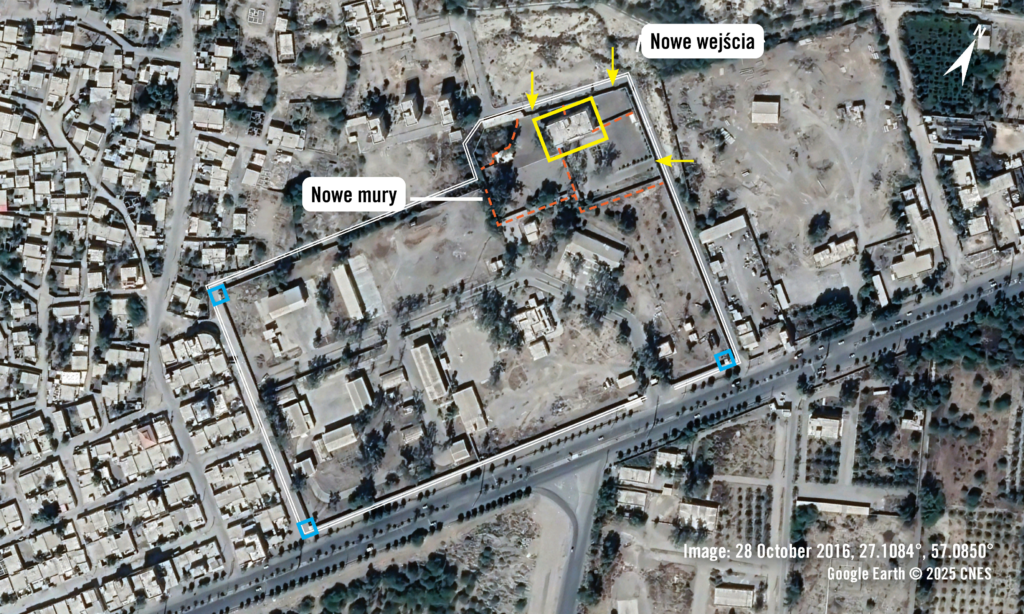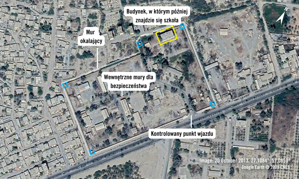 Analiza zdjęć satelitarnych z 2013 r. przeprowadzona przez Amnesty International wskazuje, że obecny budynek szkoły wcześniej znajdował się na terenie kompleksu IRGC, ale później został odgrodzony murem i utworzono oddzielne wejścia dla osób postronnych. Zdjęcia satelitarne z 2016 r. wskazują, że teren szkoły został fizycznie oddzielony od kompleksu IRGC murami granicznymi i trzema oddzielnymi, ogrodzonymi wejściami. Według Shivy Amelirad budynek ten pełnił wcześniej funkcję kwatery dowodzenia tego kompleksu IRGC, zanim kilka lat temu przekształcono go w szkołę. Amnesty International nie było w stanie ustalić, kiedy dokładnie budynek został przekształcony w szkołę.